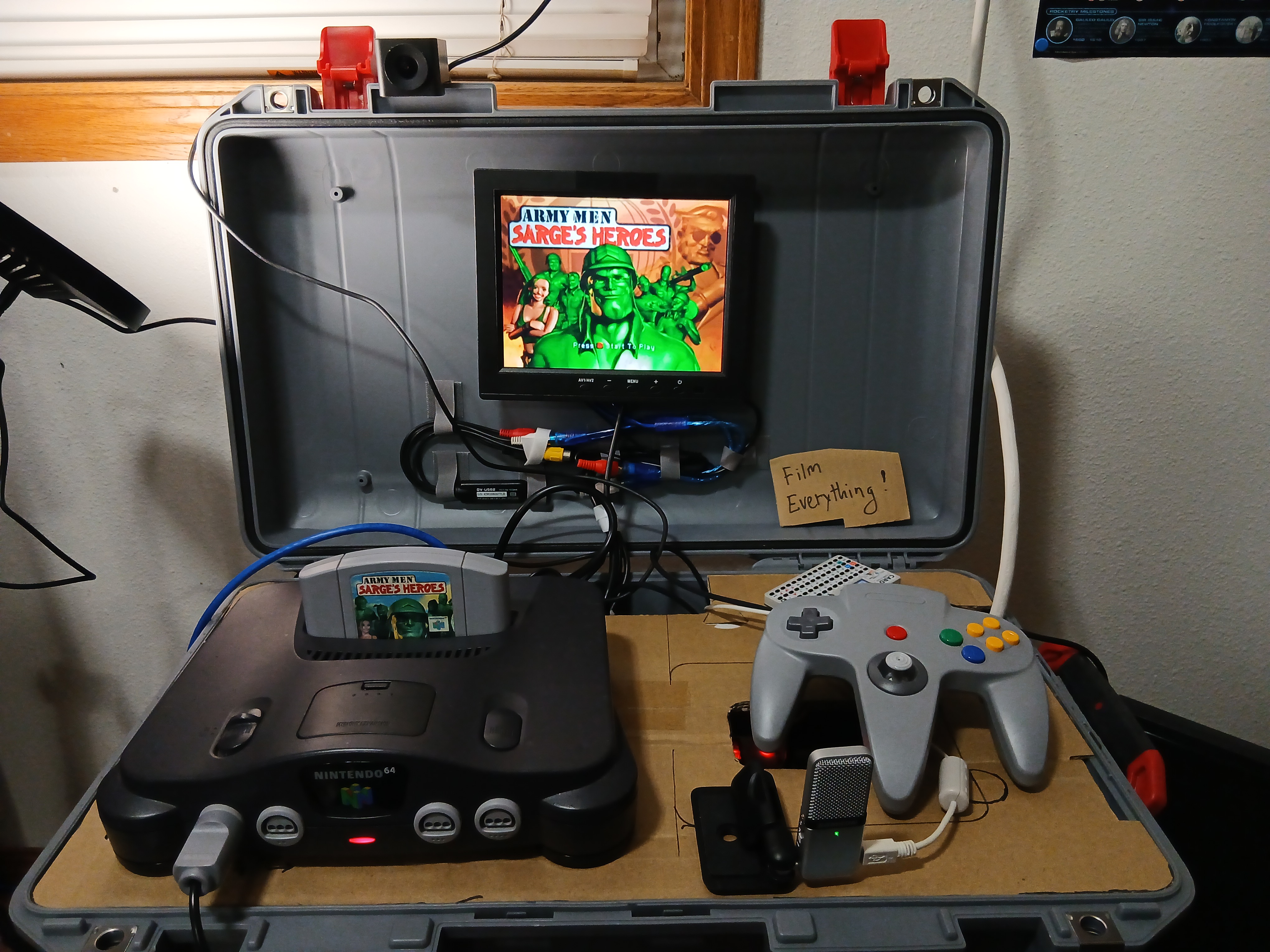 Testing the setup with custom cardboard. Integrating the computer, capture card, microphone, webcam, N64, Pelican case